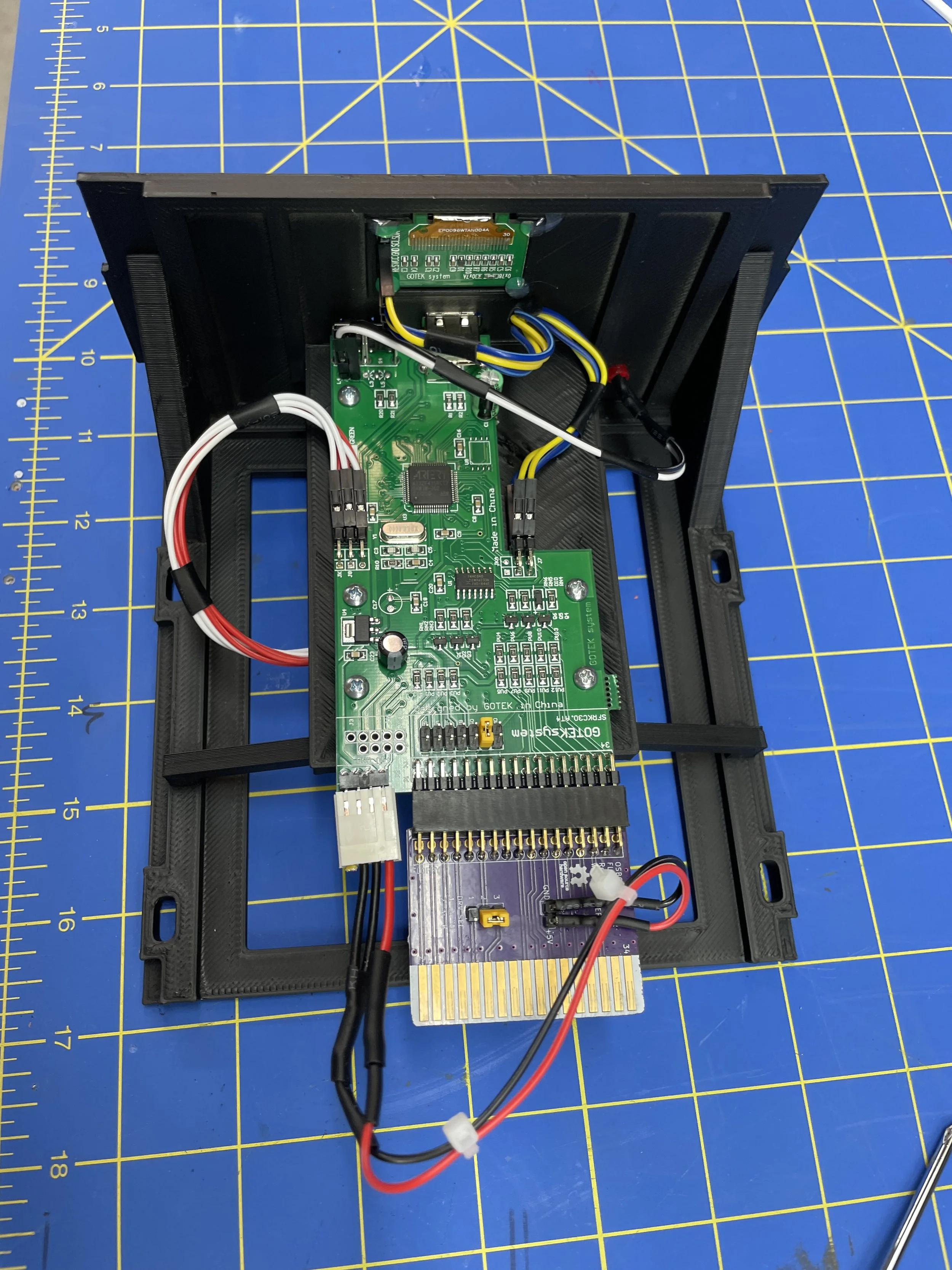 Goteks don’t physically fit super well in the Osborne. The Osborne front bezel covers the front of most of each floppy drive. I really didn’t like the look of the installation like that. Not wanting to modify the Osborne bezel, I decided to design and 3D print a custom drive carrier for the Gotek that stacked Gotek controls vertically. On top is the OLED screen, in the middle is the USB port, and at the bottom is the rotary knob used to change disk images (i.e., floppy disks). The guts of Gotek emulators are on three different circuit boards making this configuration possible with longer jumper wires installed.