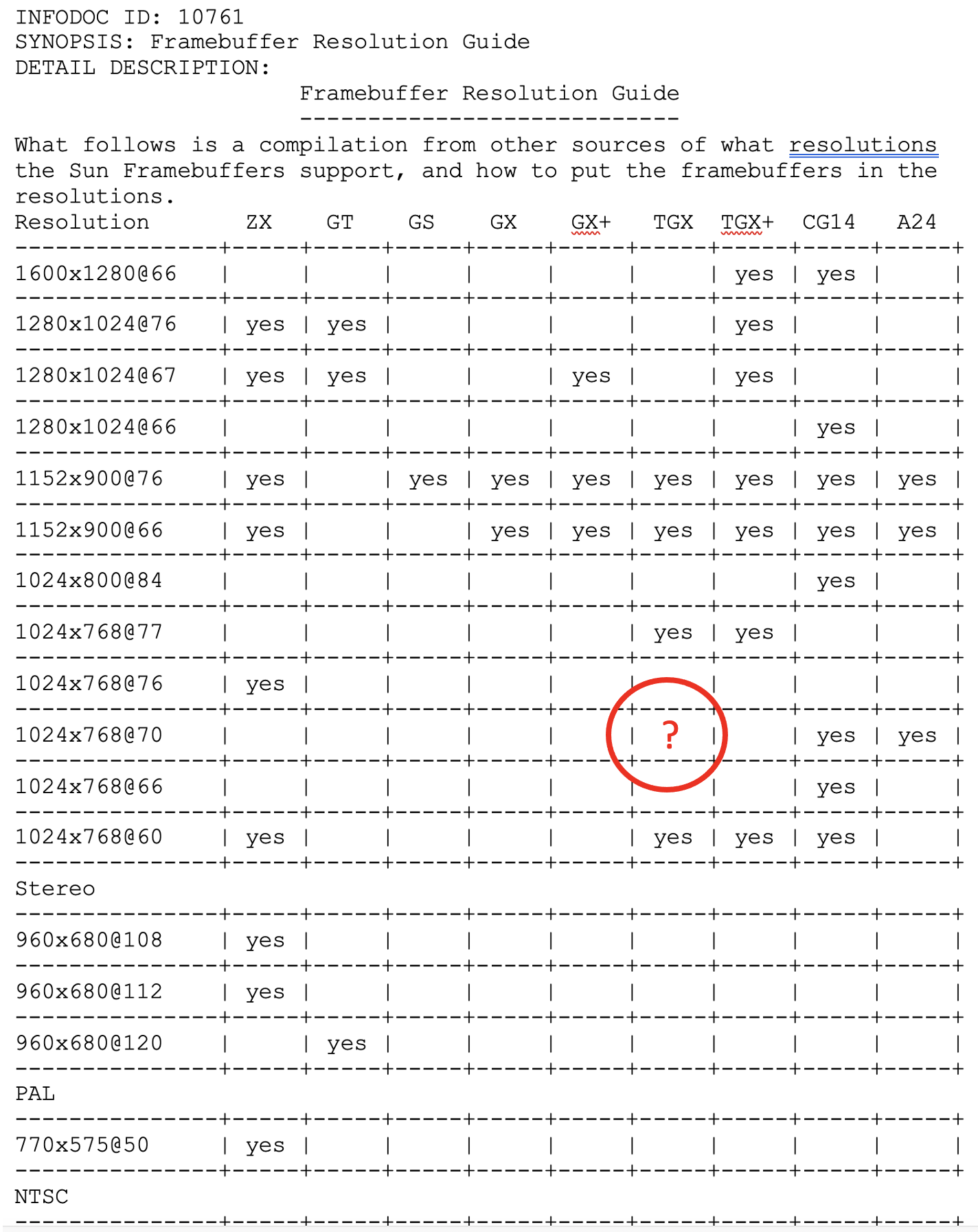 Possible solutions were starting to narrow. After some more research, I discovered that other Sun graphics cards in the same family supported an undocumented resolution of 1024x768 at 70 Hz. While this was a bit of a long shot, I tried it and it worked. The screen could sync up and seemed to work fine.