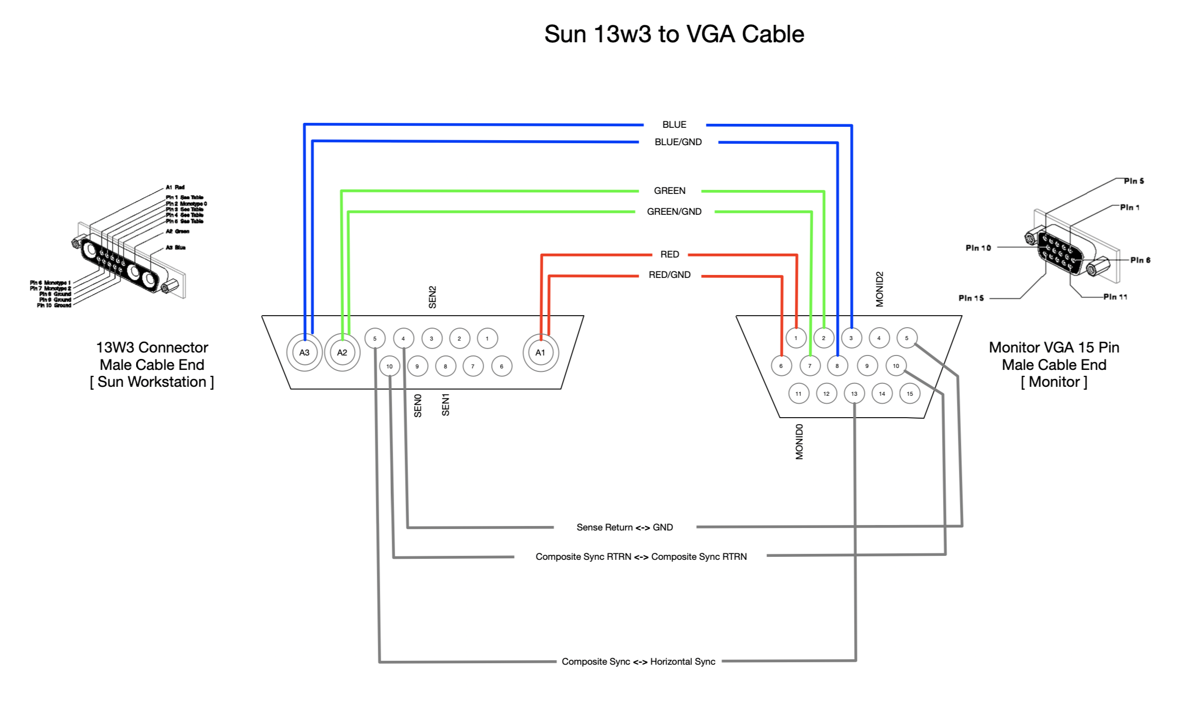 Originally, I constructed a cable using only the RGB signals and their respective grounds. Upon first inspection, this seemed to work fine. After a bit of playing around with the system, I noticed that the screen would lose sync when the Xserver would start. If I power-cycled the screen after the Xserver started, I noticed the screen would reacquire sync. Sun machines emit a sync signal on the green component signal, and while the panel seemed fine with that on boot-up, I believe it failed to reacquire sync if the image on the screen changed dramatically.
