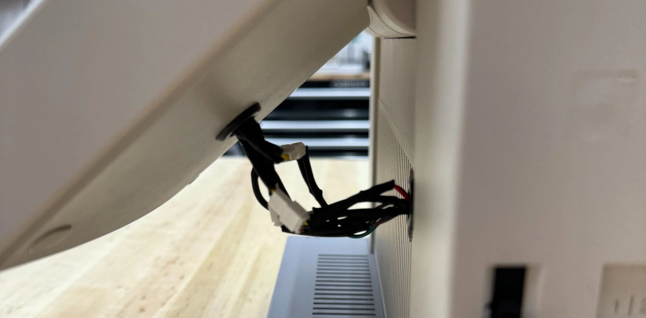 Getting the new VGA signal routed to the display was a bit more complicated. The native screen connector was not suitable for these signals, as it was directly attached to the graphics card in the Voyager. On the display side, I decided to create a new wiring path behind the screen, hidden from the user’s view, which would still allow for screen articulation.